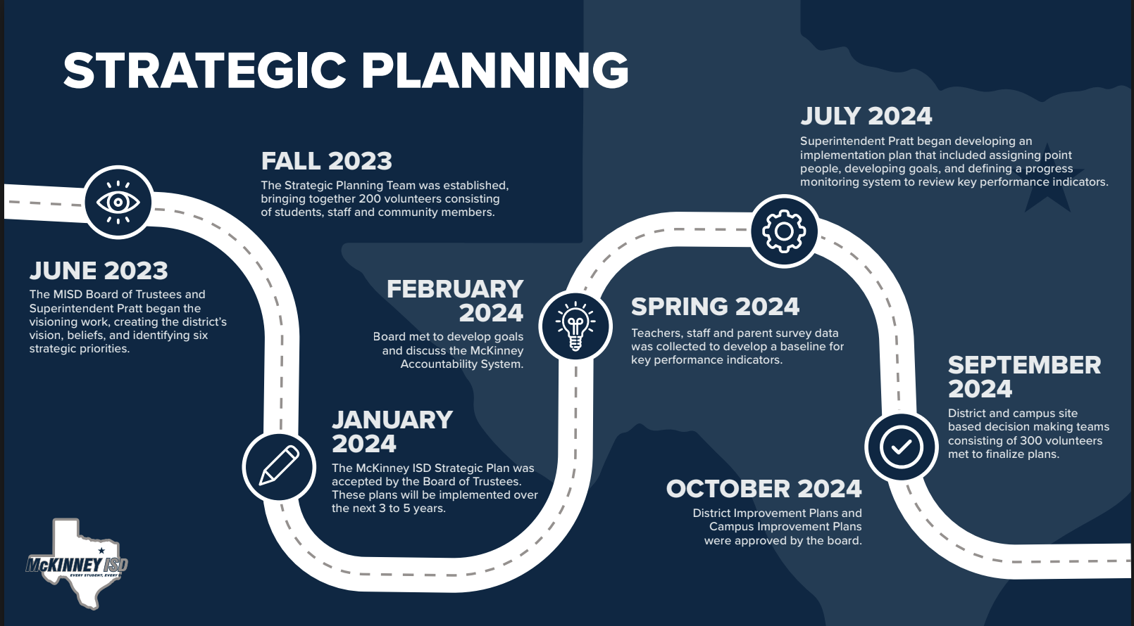 This journey began in the Fall of 2023 through our work on our McKinney ISD Strategic Plan, the Texas Public Accountability Consortium (TPAC), and a mission to discover what matters most to our community when it comes to education. The resulting McKinney Accountability System (MAS) is aligned with its vision of serving "Every Student, Every Day." This system is designed to go beyond standardized testing by evaluating performance based on the whole child and community-centered outcomes. Grounded in community values, the framework was developed with input from strategic planning, board expectations, and alignment with district and campus improvement plans. It is built around six pillars, key performance indicators (KPIs), and an evidence-based reporting structure, reinforcing transparency and community trust.